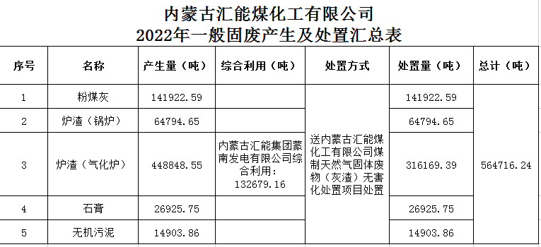 內(nèi)蒙古匯能煤化工有限公司2022年一般固體廢物信息公示