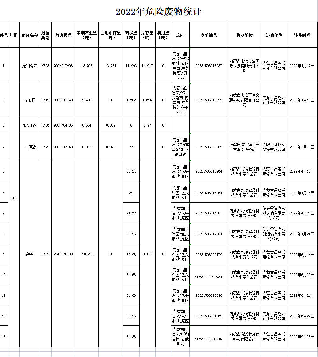 內(nèi)蒙古匯能煤化工有限公司2022年危險廢物信息公示