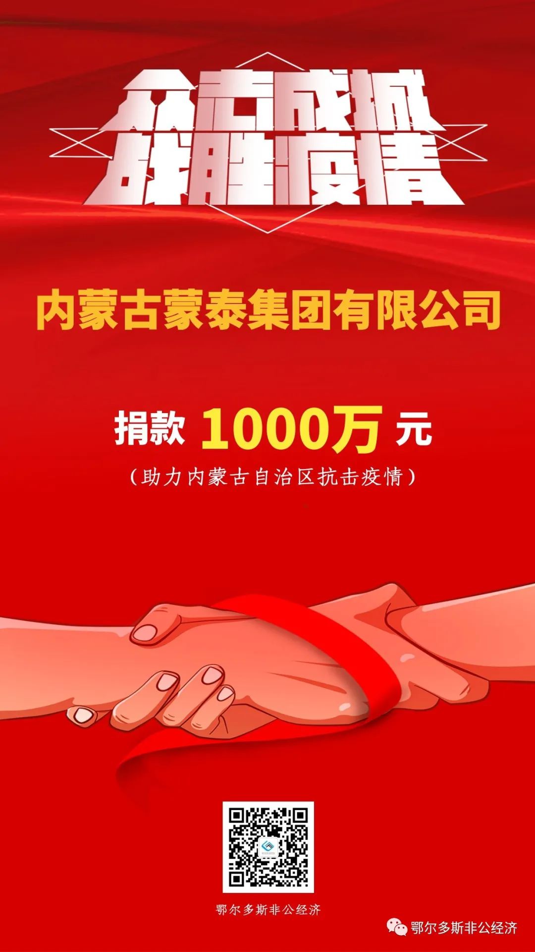 疫情發(fā)生后,我市多家民營企業(yè)聞令而動,通過捐資捐物全力配合支援呼和浩特市、包頭市打贏疫情防控阻擊戰(zhàn),匯聚起眾志成城、萬眾一心的強(qiáng)大力量。其中,匯能集團(tuán)捐款3000萬元、伊泰集團(tuán)捐款2000萬元、滿世集團(tuán)捐款1500萬元、烏蘭集團(tuán)捐款1000萬元、蒙泰集團(tuán)捐款1000萬元。民營企業(yè)以實(shí)際行動書寫熱愛祖國、奉獻(xiàn)社會、建設(shè)家鄉(xiāng)的家國情懷,彰顯了鄂爾多斯市本土民營企業(yè)的社會責(zé)任與擔(dān)當(dāng),為堅(jiān)決打贏疫情防控阻擊戰(zhàn)貢獻(xiàn)了力量。